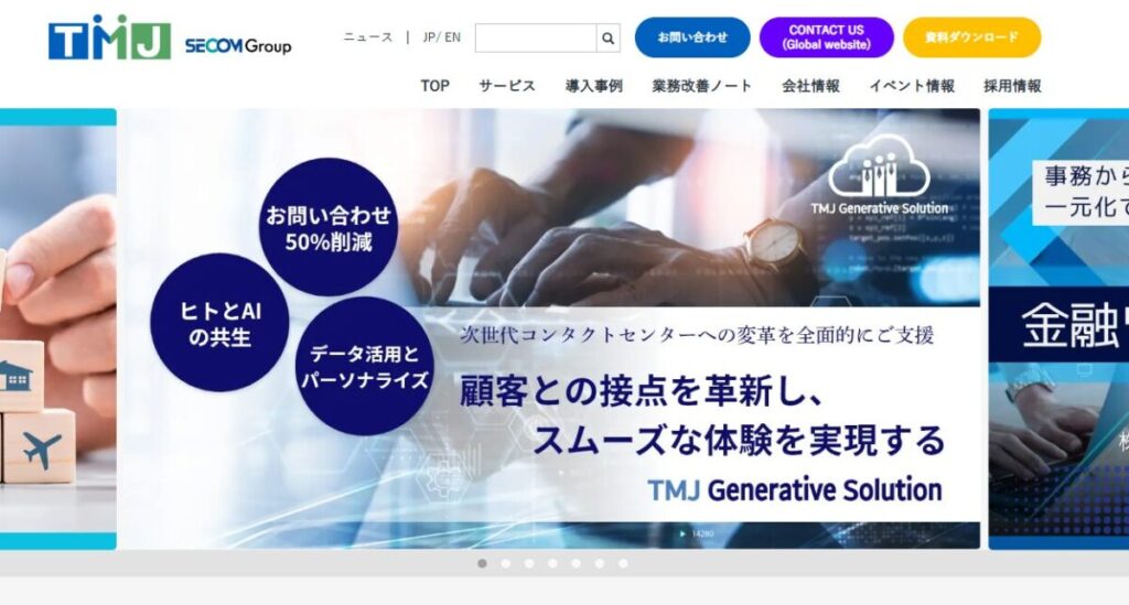 TMJ(ティーエムジェー)は、多彩なBPOサービスを展開しているセコムグループが運営するカスタマーサポート代行サービスです。AIの活用によって生産性を高め、低コストでの運営を実現します。