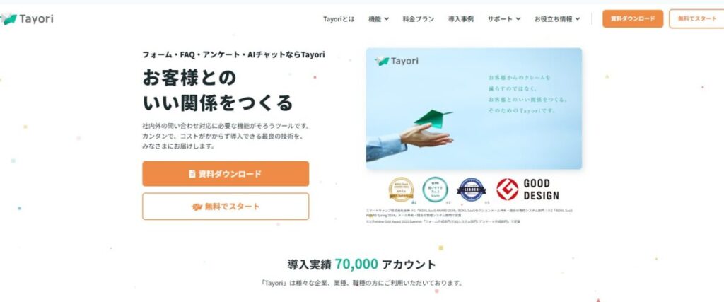 Tayori(タヨリ)は、電話以外での対応に特化したカスタマーサポート代行サービスです。FAQの作成代行やAIチャットボット構築のサポート、顧客からの問い合わせへの返信業務などを代行できます。