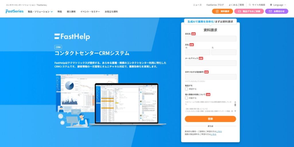 FastHelpは、20年以上の経験と技術をもとに開発されたコールセンター向けCRMです。顧客情報の管理や複数チャネルの問い合わせの一元管理、回答支援機能などを備えており、コールセンターの現場に必要な機能を網羅しています。