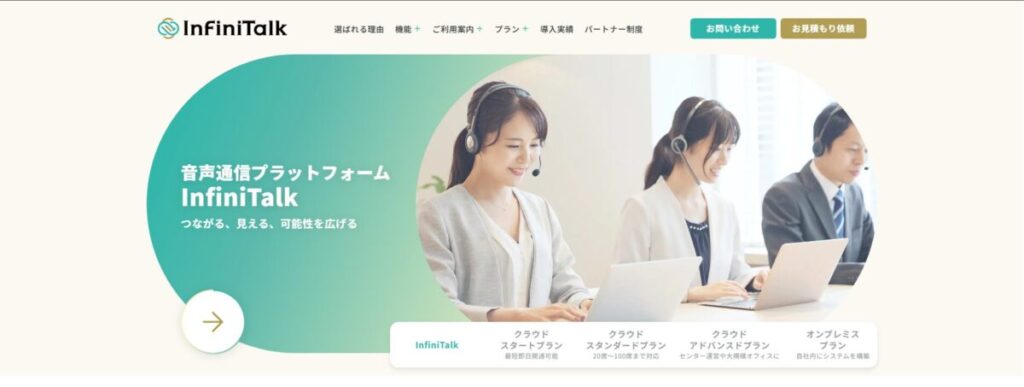 InfiniTalkは、コンタクトセンターで必要な機能を網羅したコールセンターシステムです。SMSやチャット、IVR、通話録音などに対応しています。Salesforceなどの外部CRMとの連携も可能です。