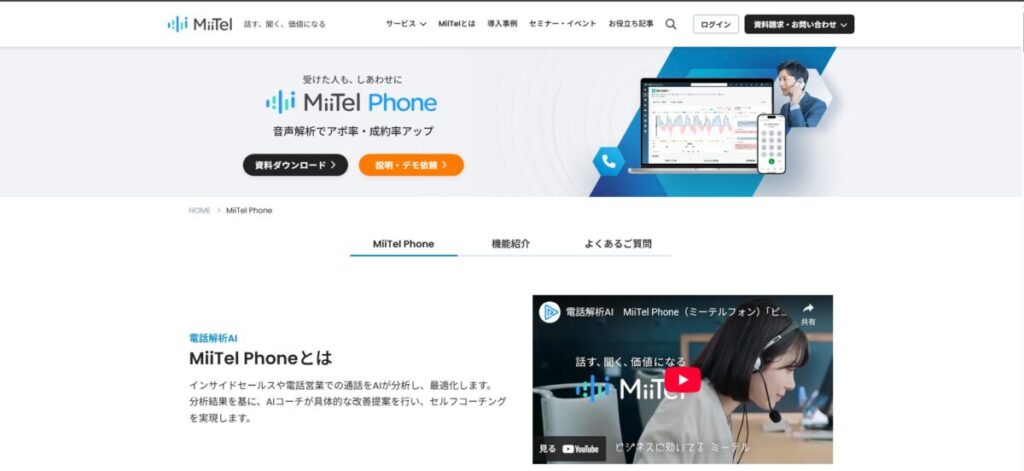 MiiTel Phoneは、AI搭載のIP電話サービスです。通話内容を録音し、文字起こしや音声解析、感情分析を行うことで、応対内容をデータとして可視化できます。