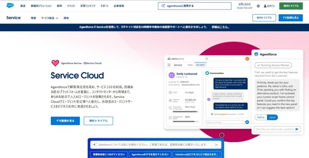 Service Cloudは、電話やメール、メッセージアプリといった多様なチャネルを一元管理できるサービスです。顧客情報やコンタクト履歴の管理ができるほか、チャット機能や分析機能も備わっています。