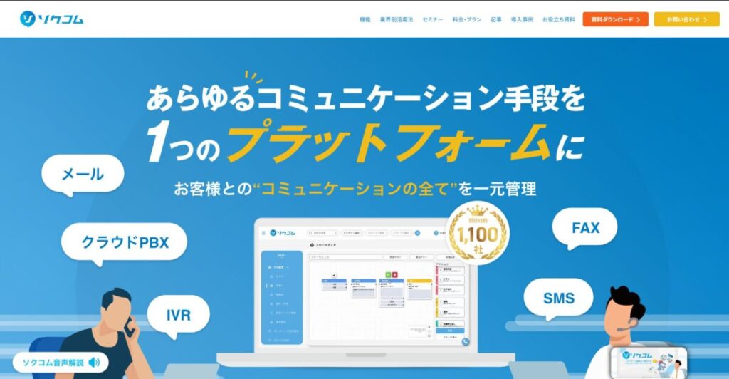 ソクコムは、電話・SMS・メールなど複数のコミュニケーション手段を統合管理できるクラウド型プラットフォームです。プレディクティブ発信や通話録音、文字起こし、モニタリングなどコールセンター業務を支援する多彩な機能を備えています。