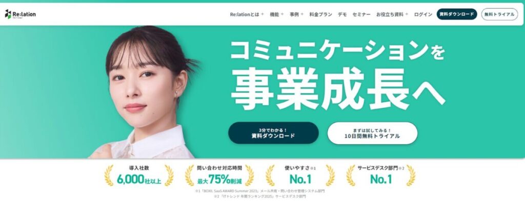 月額15,000円からとコストはかかりますが、チャットやメールによるサポート体制が整っており、組織的な品質向上を目指す企業に適しています。「BOXIL SaaS AWARD Summer 2023」のメール共有・問い合わせ管理システム部門で「使いやすさNo.1」を獲得しているのも特徴です。