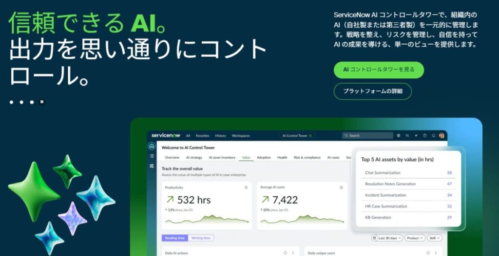 ServiceNow(サービス・ナウ)は、AIコントロールタワーで、組織内のAIを一元管理できるカスタマーサポートツールです。戦略的にリスクを管理し、単一のプラットフォームであらゆる業務に対応します。