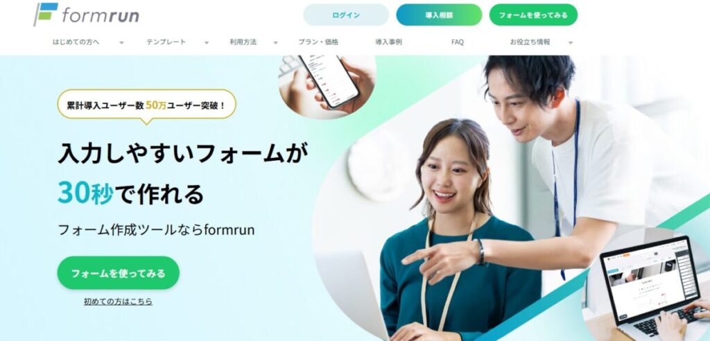 | formrun(フォームラン) | ・高機能な問い合わせフォームを作れる ・問い合わせをチームで効率的に処理できる管理機能が特徴 ・簡単に使える操作性が魅力 | ・初期費用:0円 ・月額費用:3,880円~ ・月額フリープランも用意 | ・活用方法などの各種セミナーを開催 ・AIが24時間365日サポート ・メール対応・マニュアルを無料提供 |
