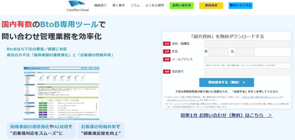 | CarePlus Cloud(ケアプラス クラウド) | ・BtoB特化型 ・情報を一括管理できるため共有がスムーズ ・過去の対応や質問を蓄積・検索可能 | ・要問い合わせ | ・導入時のサポートや設定支援が可能 ・運用・活用方法のサポートは個別相談会にて対応 |