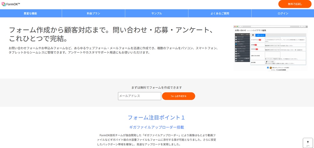 長年のサービス提供により、安定した運用環境とノウハウが蓄積されている点も信頼の証です。運用後の使い勝手もシンプルに設計されており、まずは手間なくメールフォームを設置したい場合に適しています。