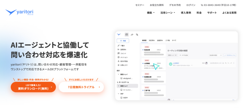 「yaritori」は、代表メールアドレスを複数人で管理できる機能やAIによるメール自動返信機能などが備わったメールソフトです。
