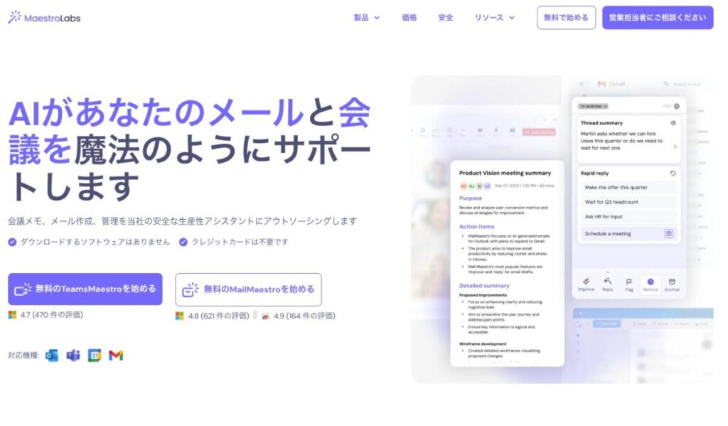 | MailMaestro | Gmailに拡張して返信文生成を補助し、文面調整まで行いやすい | 無料〜(プランによる) |