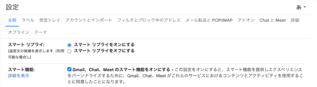 - 「全般」タブで「スマートリプライ」をオンにし、「スマート機能」の「Gmail、Chat、Meet のスマート機能」をオンにします。