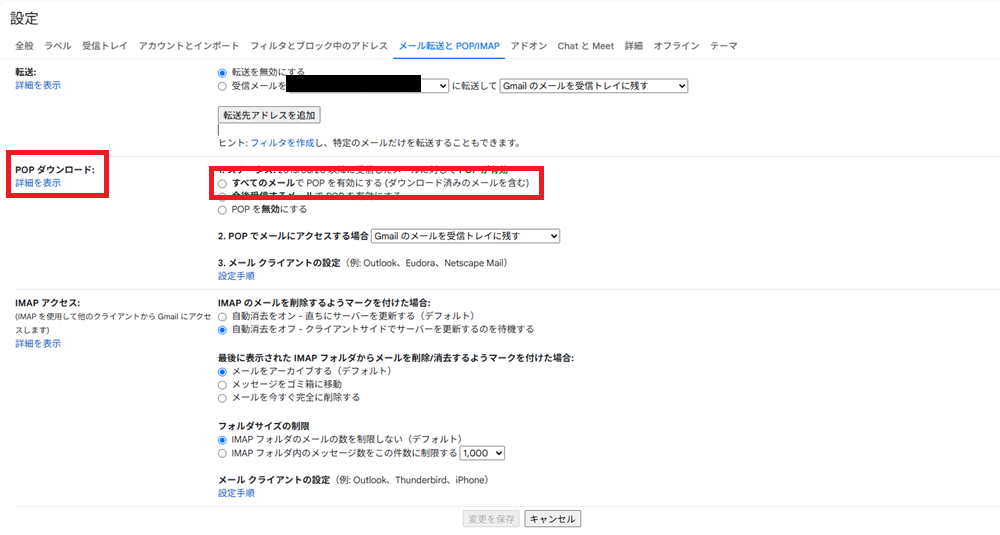 2.「POP ダウンロード」で「すべてのメールで POP を有効にする」をオンにし、下部にある「変更を保存」をクリックします。