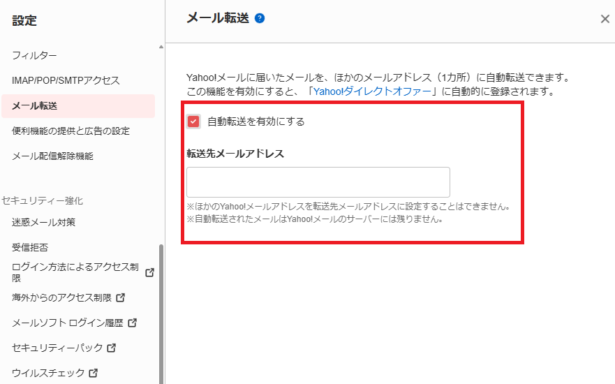 2.「自動転送を有効する」にチェックを入れ、転送先メールアドレスを入力します。この際、自動転送されたメールは、Yahoo!メールのサーバーには残らなくなるので注意しましょう。