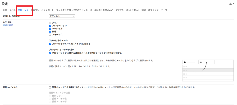 2.「受信トレイ」をクリックし、「受信トレイの種類」から「マルチ受信トレイ」を選択します。