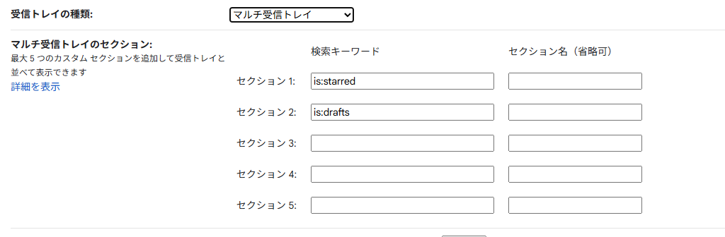 3.「マルチ受信トレイのセクション」で、セクション1の検索キーワードに「 to:(管理したいサブアドレス) 」と入力し、セクション名(例:個人用)を付けます。