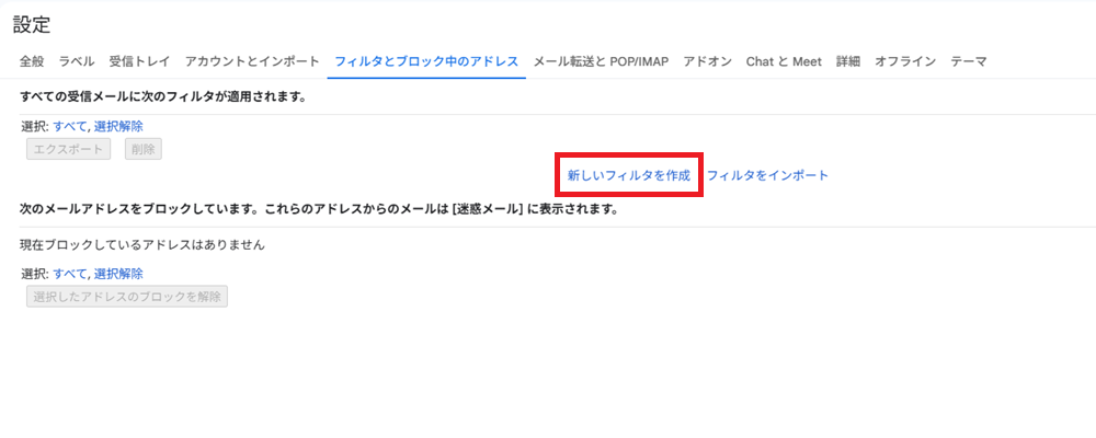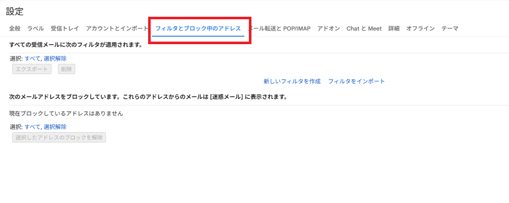 1.Gmailの「設定」>「すべての設定を表示」>「フィルタとブロック中のアドレス」タブを開きます。