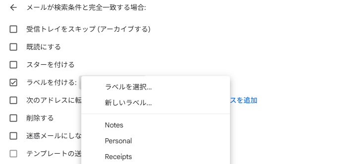 4.「ラベルを付ける」にチェックを入れ、適用したいラベルを選択(なければ新規作成)します。
