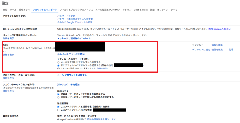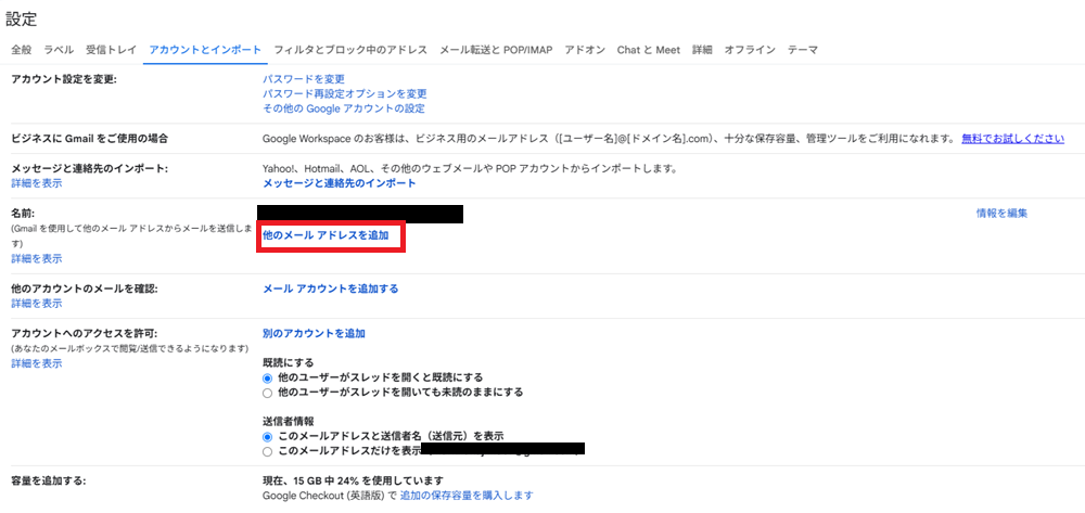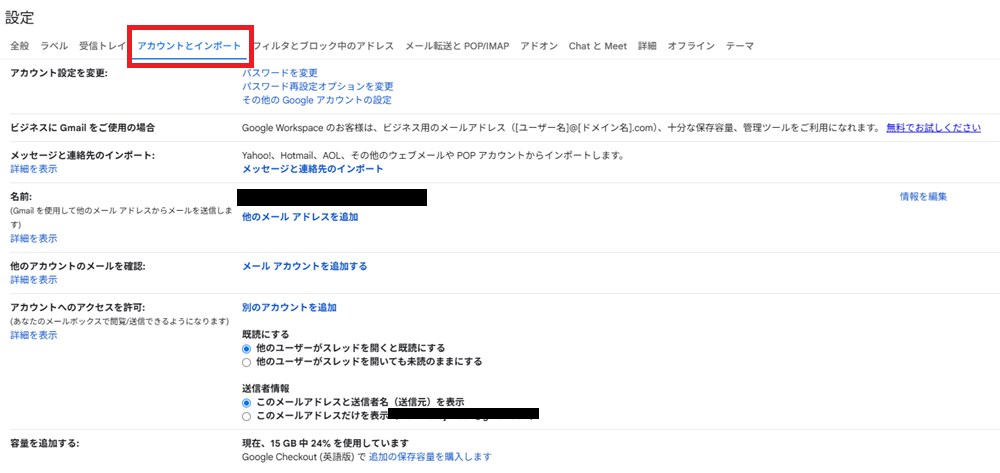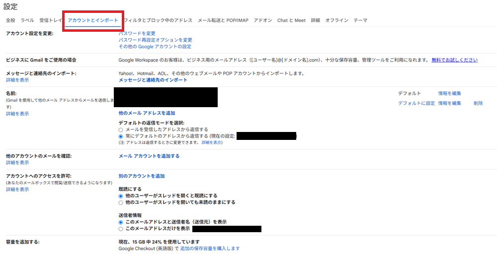 1.Gmailの「設定」>「すべての設定を表示」>「アカウントとインポート」タブを開きます。
