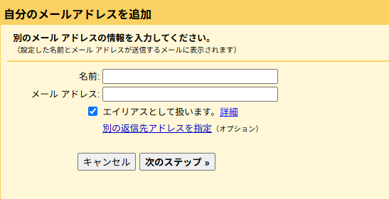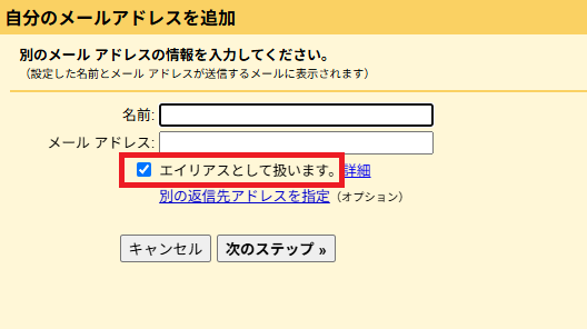 3.表示されたウィンドウに、差出人として使いたい名前とメールアドレスを入力し、「次のステップ」をクリックします。この際に、「エイリアスとして扱います。」にチェックが入っていることを確認します。
