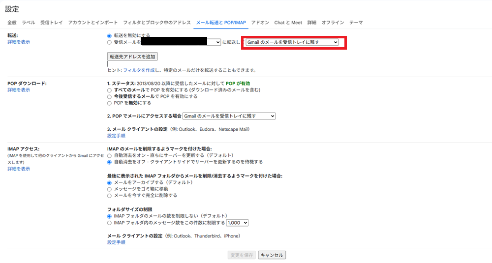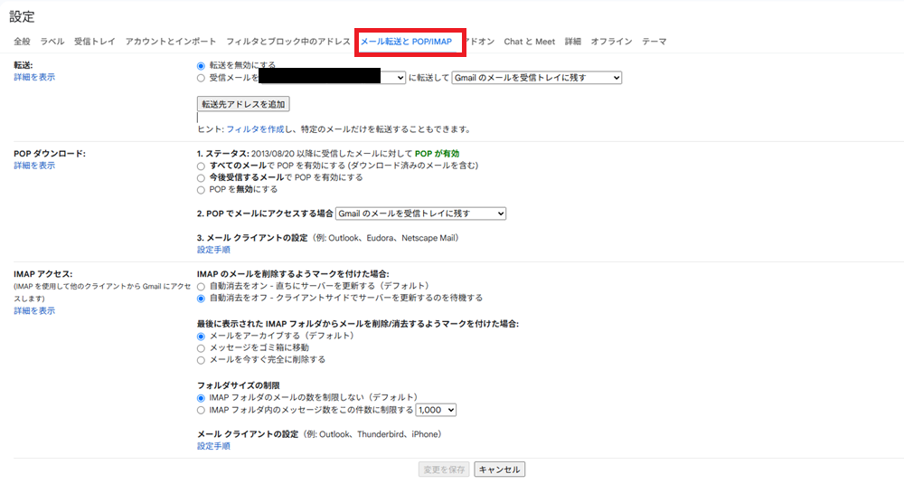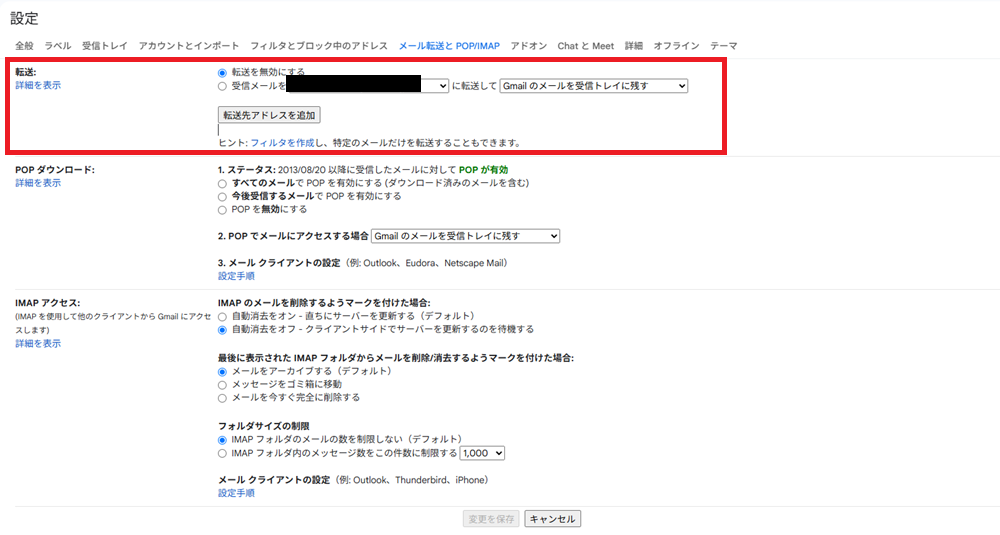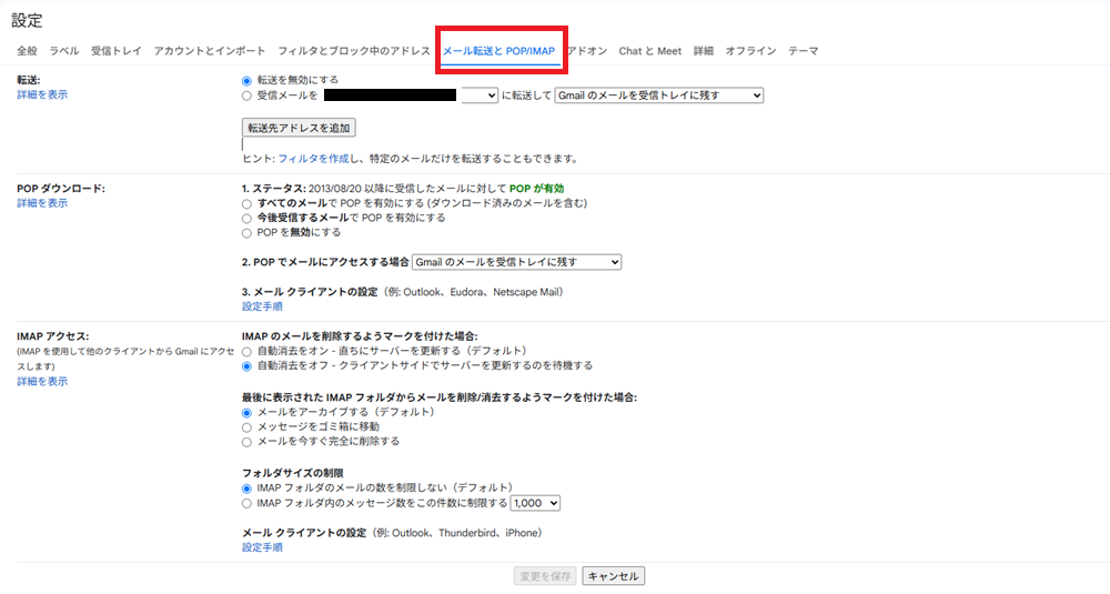 1.転送元のGmailで、「設定」>「すべての設定を表示」>「メール転送とPOP/IMAP」タブを開きます。