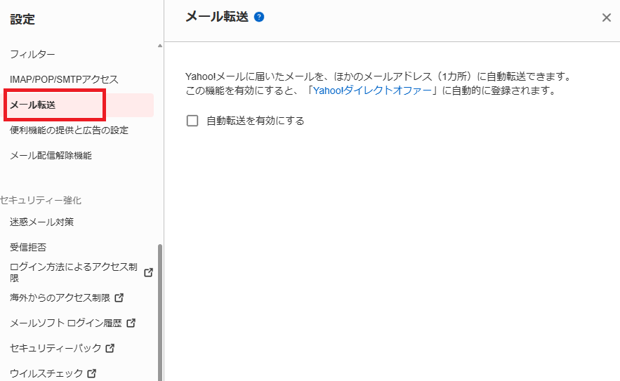 1.転送元のYahoo!メールを開き、「設定」>「メール転送」を選択します。