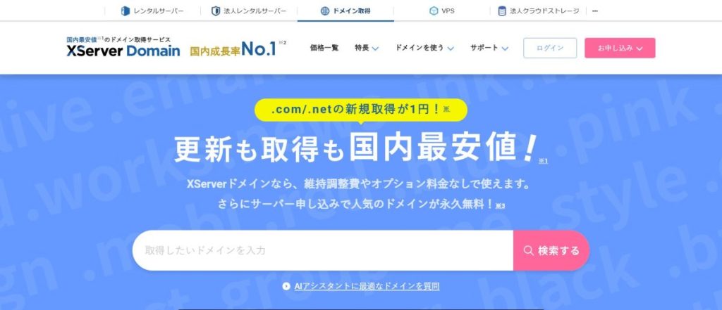 Xserverドメインは、国内シェアNo.1のレンタルサーバー「エックスサーバー」との連携で、ドメインが永久無料になる特典が最大の魅力のドメイン取得サービスです。