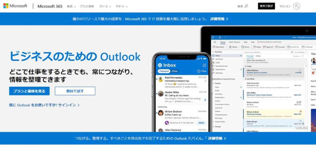 Outlook.comは、Microsoft社が提供するクラウドメールサービスです。WordやExcel、TeamsといったOffice製品との連携がスムーズで、メール画面から直接ファイルのプレビューや編集ができるなど、業務効率を高める機能が充実しています。