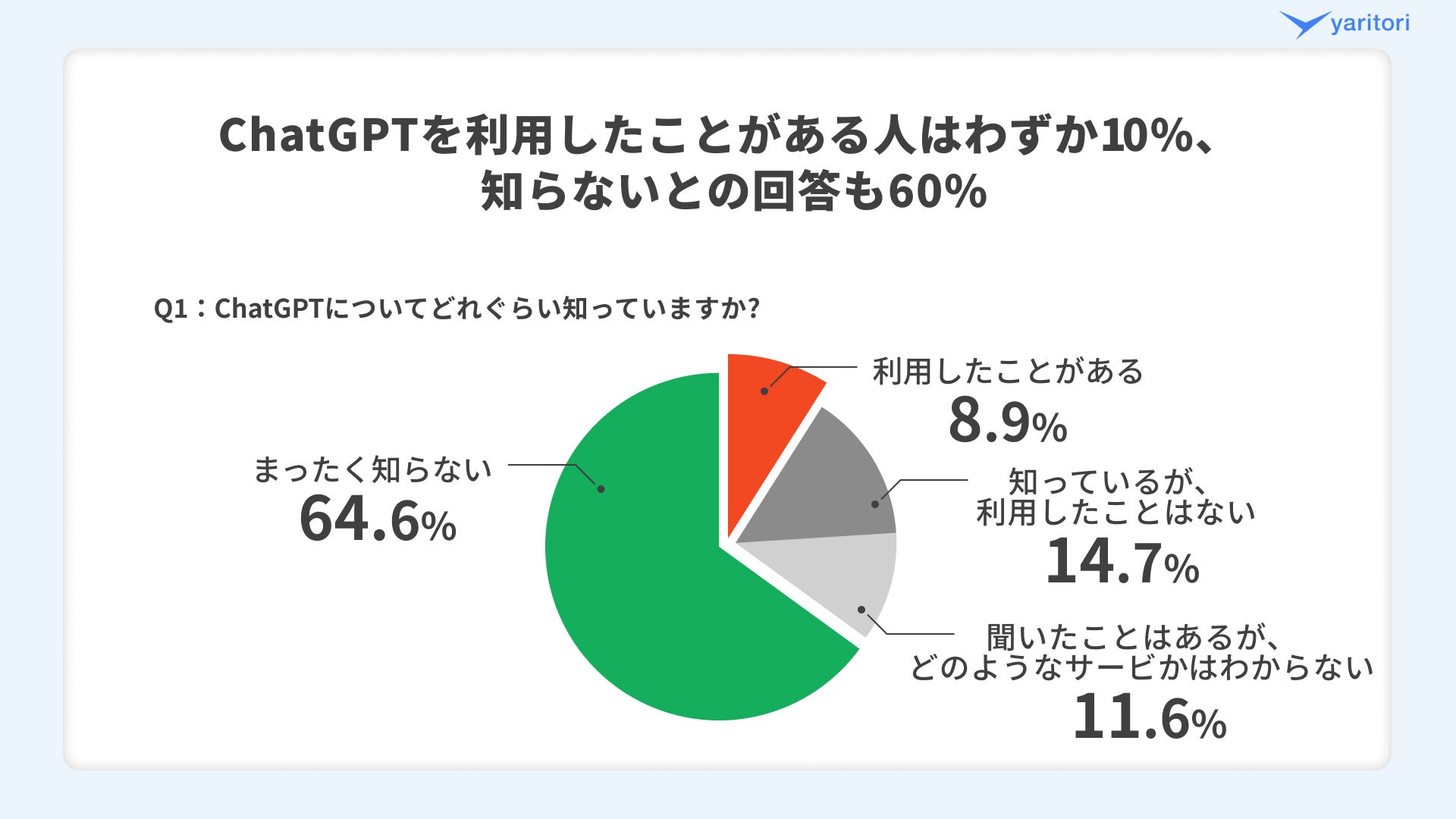 認知度調査では、「ChatGPTを利用したことのあるビジネスパーソンはわずか『8.9%』、まったく知らないという回答も6割超(64.6%)」という結果ができました。