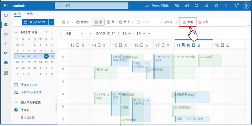 チームで円滑に業務を進める上で、「カレンダー共有」機能は強力なツールです。この機能を使えば、チームメンバーの予定を一覧で確認できるため、「誰がいつ空いているか」を探す手間が省け、会議の日程調整などをスムーズに行えます。
