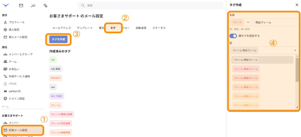 また、親タグを設定できるため、「クレーム/商品の品質」「クレーム/対応品質」「クレーム/納期関連」のように、同系列のタグをさらに細かく分類することが可能です。