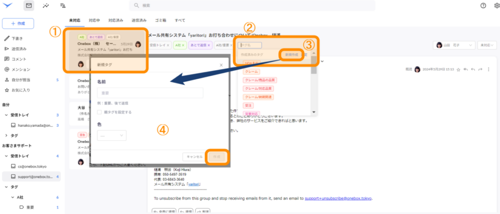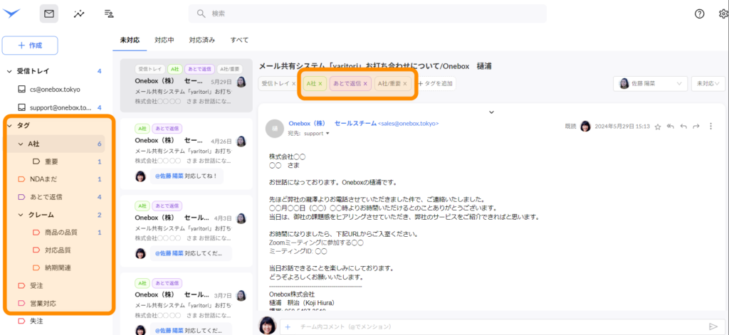 「クレーム」「部長確認待ち」「重要」「見積もり」「電話で対応済み」など、好きなようにタグをカスタマイズすることができます。