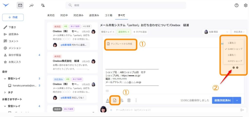 テンプレートや署名はワンクリックで挿入できるので、定型的なメール対応を大幅に時間削減することができます。