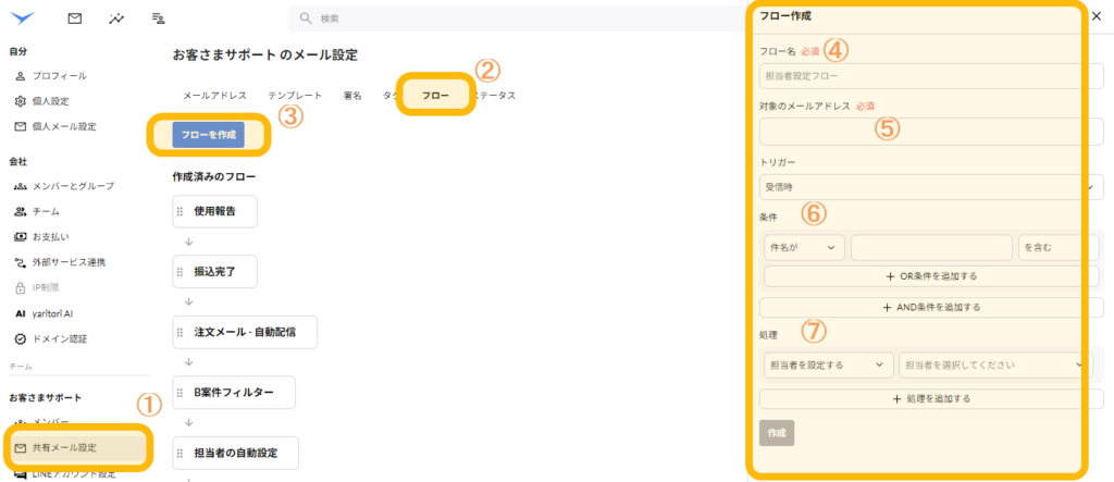 フローは受信したメールのタグ付けや、担当者の振り分けなどを自動化するための機能です。