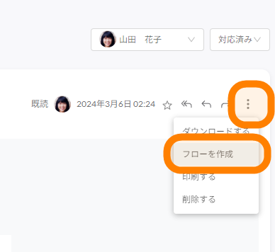 ※1 特定の受信メールの右上の三点リーダーからフローを作成することもできます。この場合、対象のメールアドレスやfromのアドレスには該当のメールアドレスが自動的に入ります。