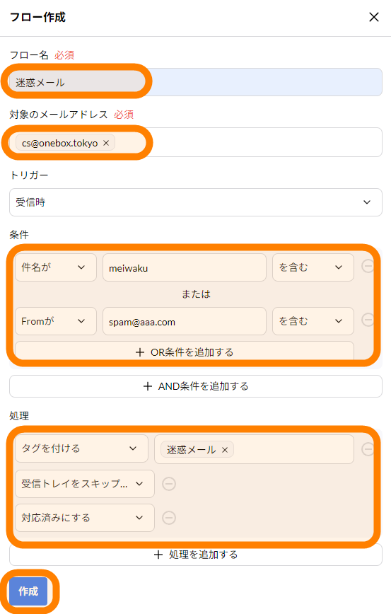 - 以下の例を参考に迷惑メールのフローを作成します。