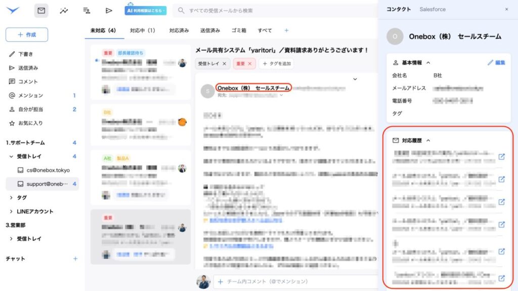 メールの詳細を開いた上で、メールの宛先をクリックすると右側にサイドバーが表示され、該当のアドレスとの対応履歴を確認することが可能です。