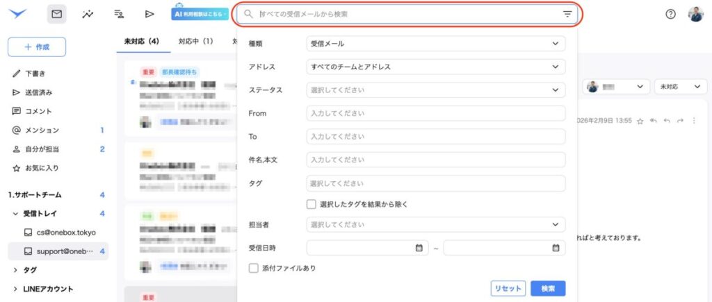 画面上部の検索窓から、「受信メール」「送信メール」の検索が可能です。