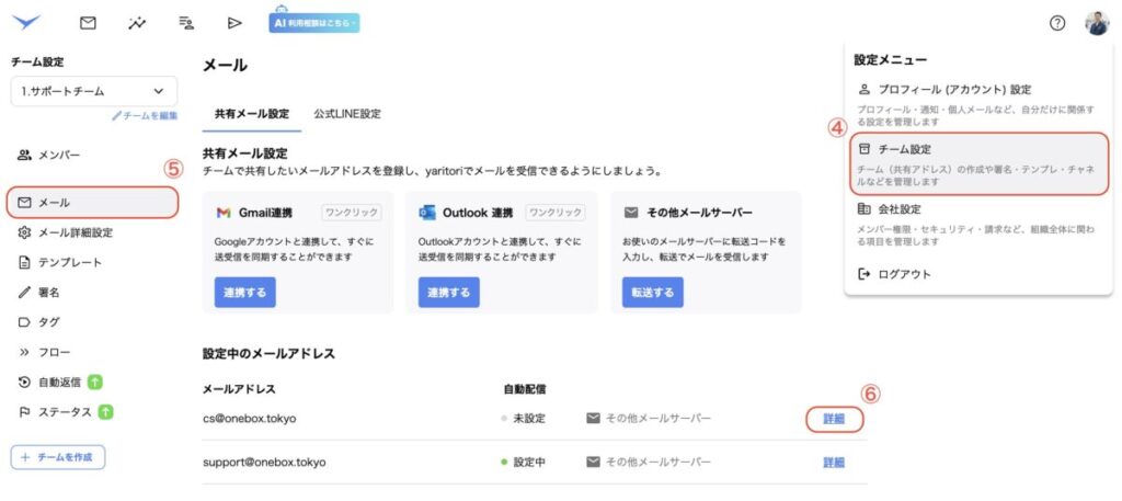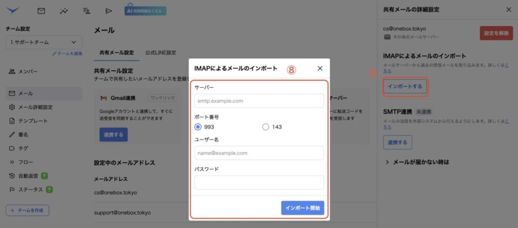 ⑤IMAPインポートを実施したいチームの「メール」をクリック