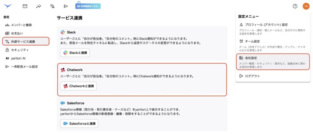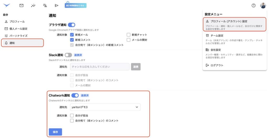 画面右上のアイコン>「プロフィール(アカウント)設定」>「通知」の順に進み、Chatwork連携をONにして、通知対象を選択してください。