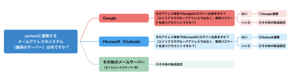 yaritoriでは、現在ご利用中のメール環境に応じて、以下の3つの方法から受信設定を行っていただきます。