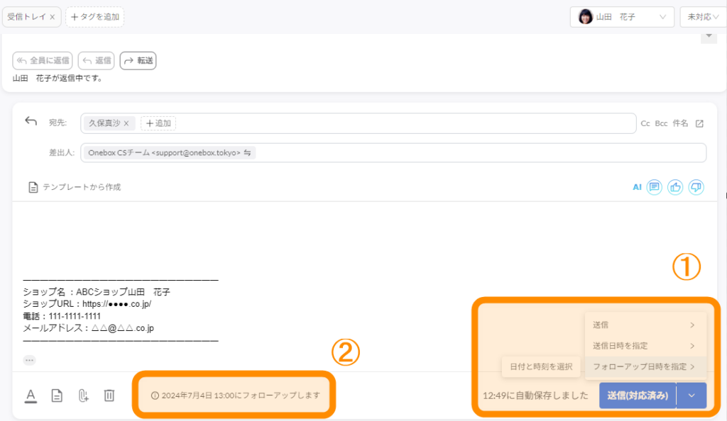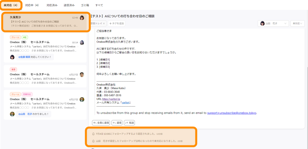 設定した受信メールは未対応フォルダに戻り、メールごとの対応履歴にも「フォローアップ日時になったので未対応になりました。」と記載されます。(※1)