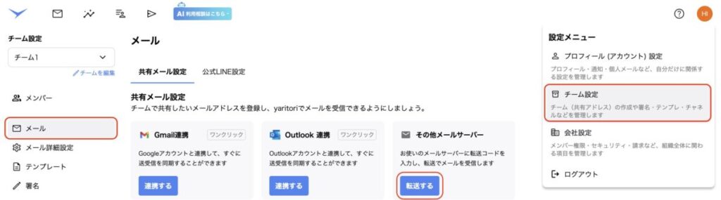 ①画面右上のアイコンから「チーム設定」>「メール」の順に開きます。