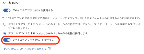 ※処理が重いと、IMAPをONにするボタンの設定がうまくできない可能性があるため、以下ご確認・お試しください。(2024/12 Microsoft確認済)
