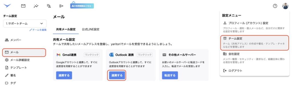 ①画面右上のアイコンから「チーム設定」>「メール」の順に開き、Outlook連携ボタンをクリックします。