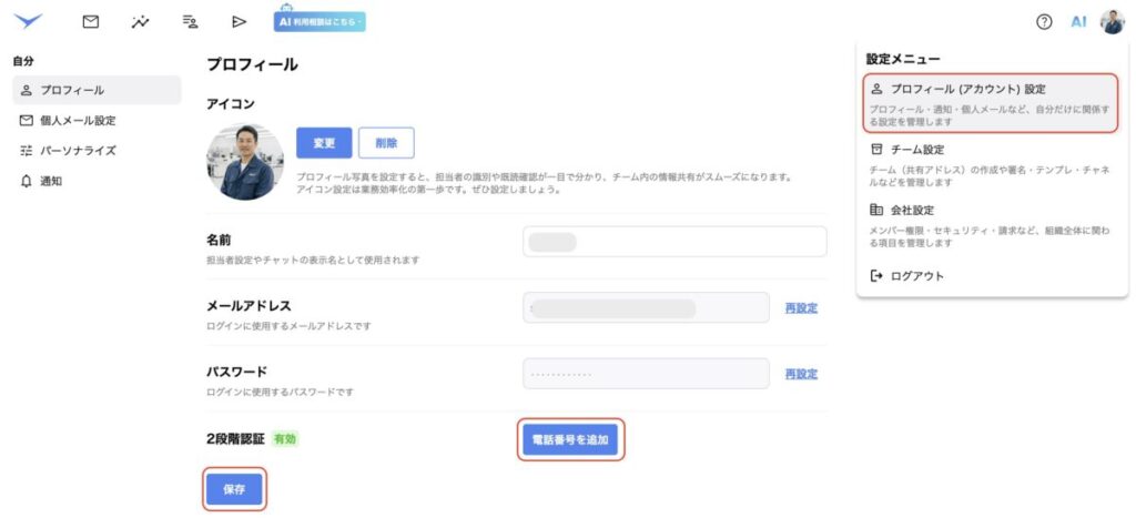 ・「プロフィール(アカウント)設定」をクリック>電話番号を追加>yaritoriのパスワードと電話番号を入力>保存