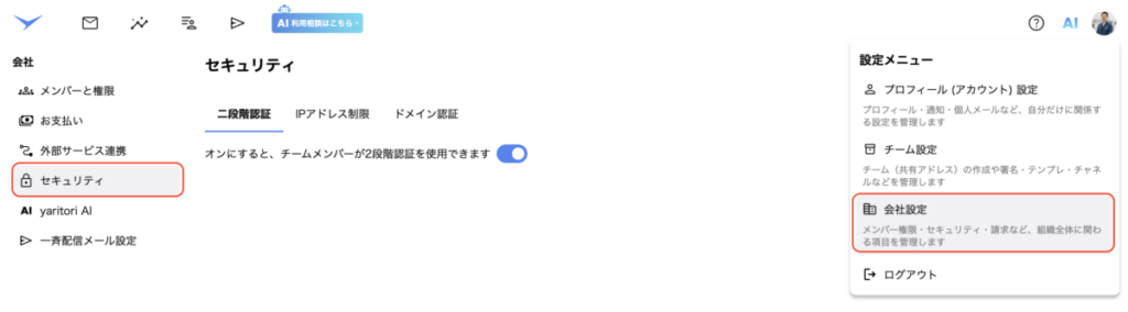 画面右上のアイコン>会社設定>セキュリテイの順序で設定画面に遷移できます。