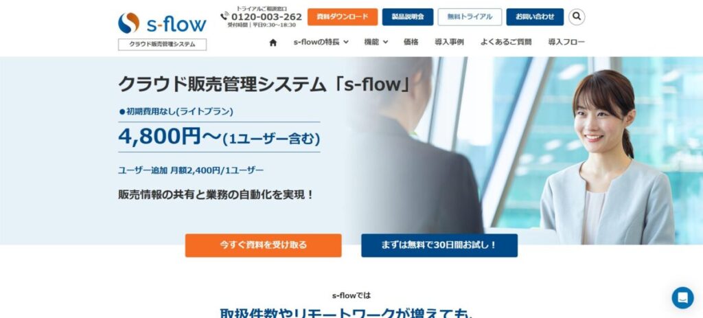 「s-flow」は、在庫管理、入出金管理、会計連携機能を標準装備した中小企業向けクラウド販売管理システムで、 卸販売・ネット販売・店舗販売の統合管理を実現。業務に合わせてカスタマイズできるプランもご用意している点が特徴です。