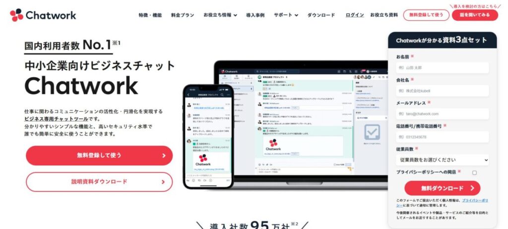 Chatworkは、Chatwork株式会社が提供するクラウド型ビジネスチャットツールです。他のチャットツールとの大きな違いはタスクの設定・割り振り・管理ができる点です。一度設定したタスクは完了ボタンを押すまで残り続けるので、対応漏れ防止になります。