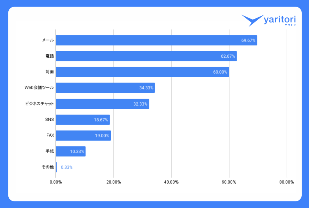 当社が実施した「ビジネスメール調査2026」によると、仕事で最も利用されているコミュニケーション手段は依然として「メール」(69.67%)が第1位でした。